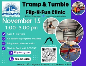 Join us on November 15 from 1-3 PM for CCG's Tramp & Tumble Flip-N-Fun Clinic - an exciting afternoon of flips, jumps, and fun for kids ages 4-16 of all skill levels! Bring your tramp shoes or socks and get ready to flip into fall with Central Coast Gymnastics!