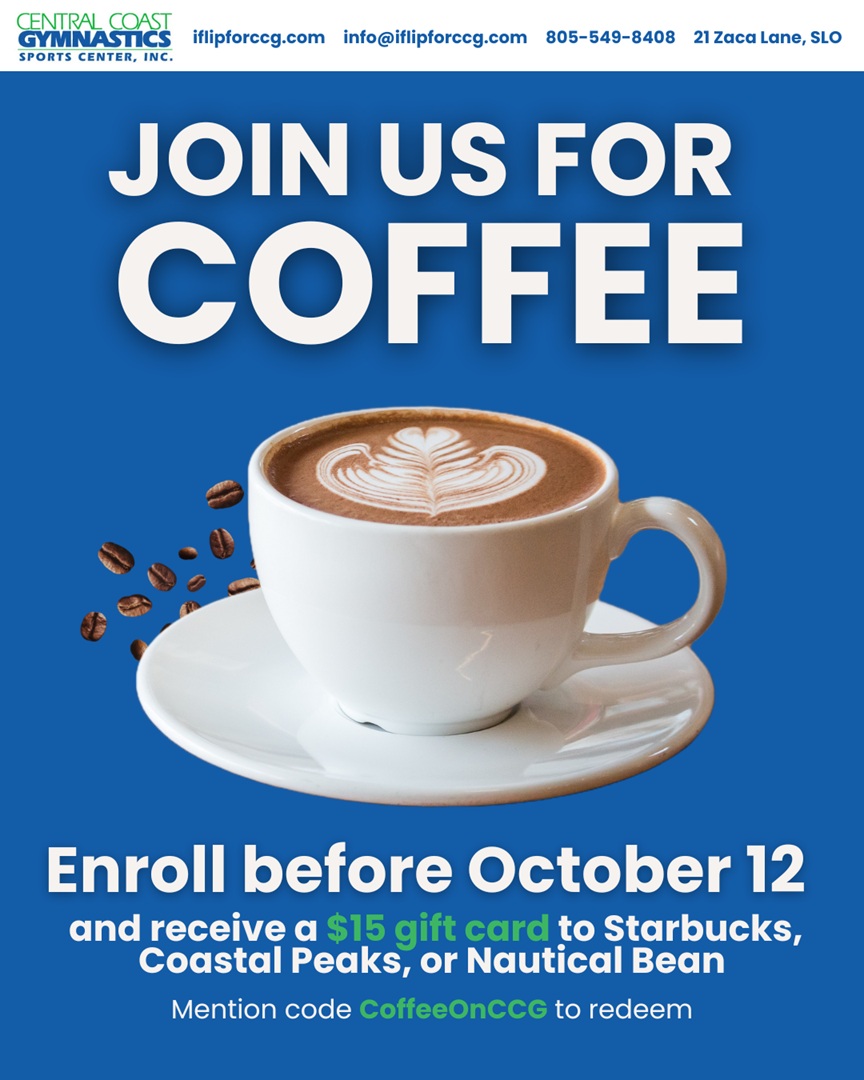 Enroll before October 12th and receive a $15 gift card to Starbucks, Coastal Peaks, or Nautical Bean. Mention code CoffeeOnCCG to redeem.