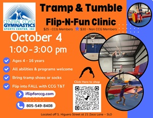 CCG’s Flip n' Fun Clinic is perfect for athletes of all levels and abilities, ages 4 and up! Come flip with us from 1-3pm on 10/4!