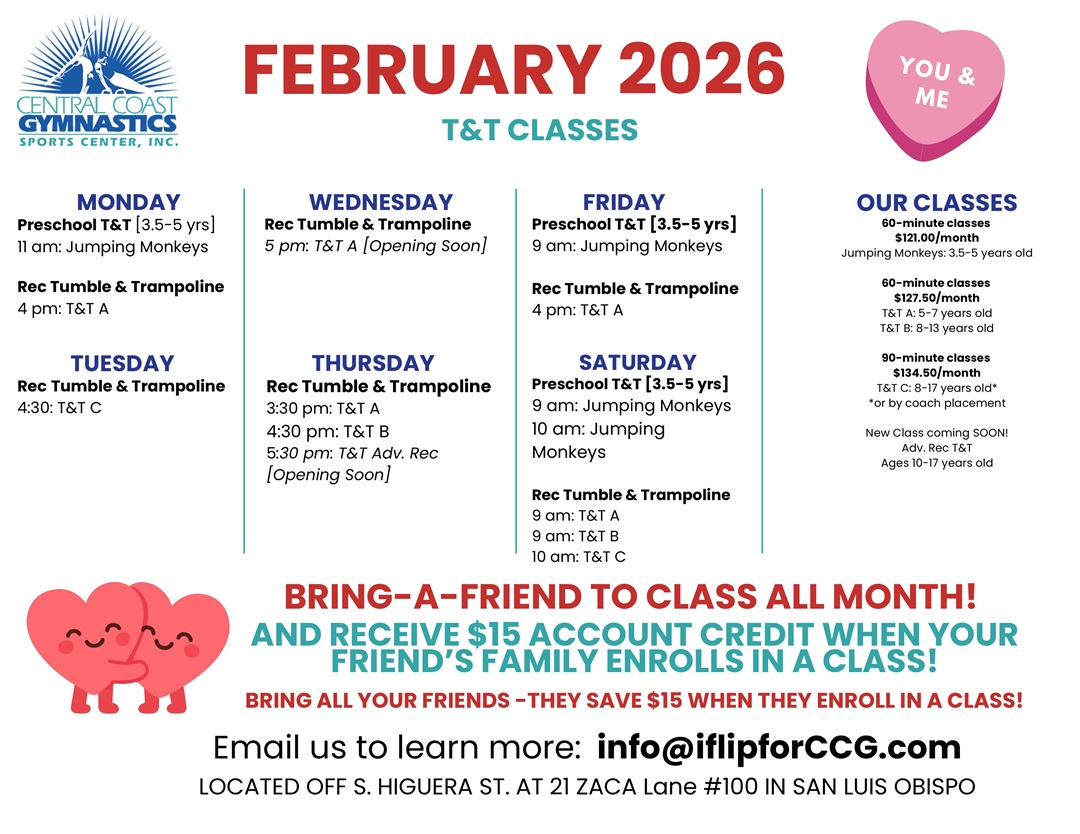February is Bring A Friend month! Receive a $15 account credit when your friend's family enrolls in a class!