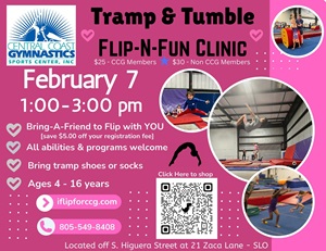 Join us on February 7th for our Flip n' Fun T&T Clinic. All abilities & programs welcome! *Be sure to bring your tramp shoes or socks
