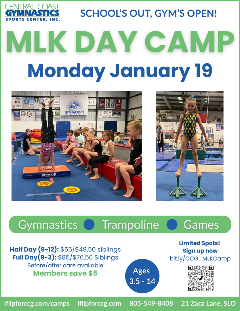School's Out, Gym's Open! Celebrate MLK Day with a leap in the right direction at our amazing day camp. Your child will enjoy a high-energy day filled with gymnastics, trampoline sessions, and exciting group games.