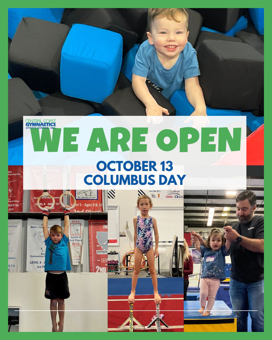 CCG is open for Columbus Day (Monday the 13th). We'll see you for all regularly scheduled classes!