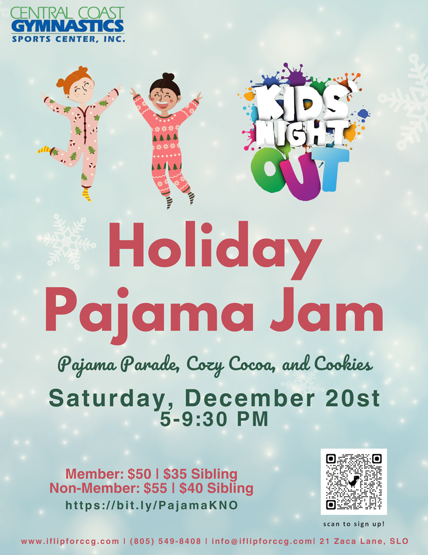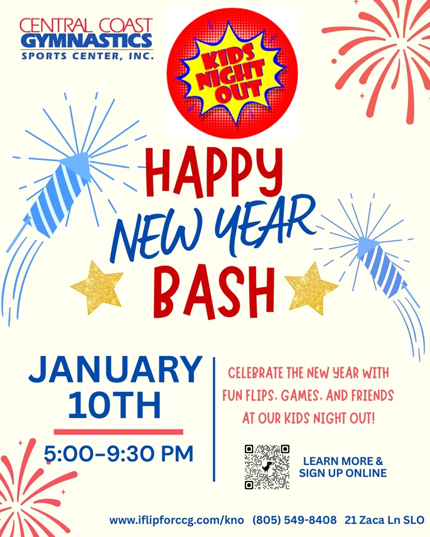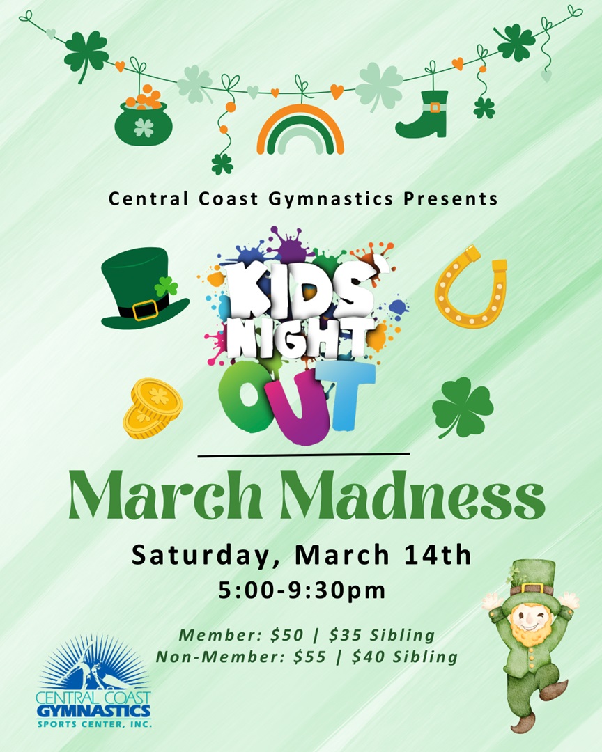 Central Coast Gymnastics is bringing back our Kid’s Night Out events! This 4.5 hour event will be held once a month and is perfect for kids ages 4-14! Everyone will enjoy fun gymnastics stations, themed activities, crafts, interactive games, pizza, snacks, and a movie!