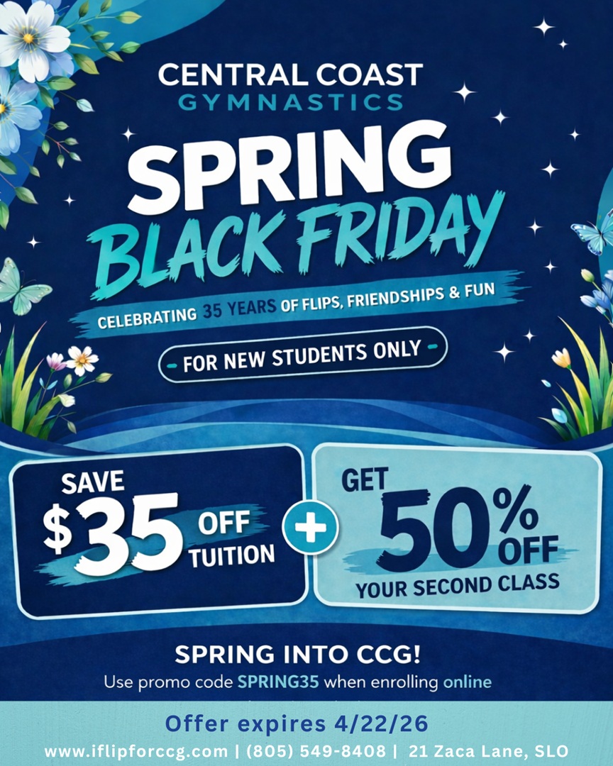 Spring into CCG! We're celebrating 35 years of flips, friendships & fun! Use promo code SPRING35 when enrolling online and save $35 on tution. Plus get 50% off your second class! (new students only)