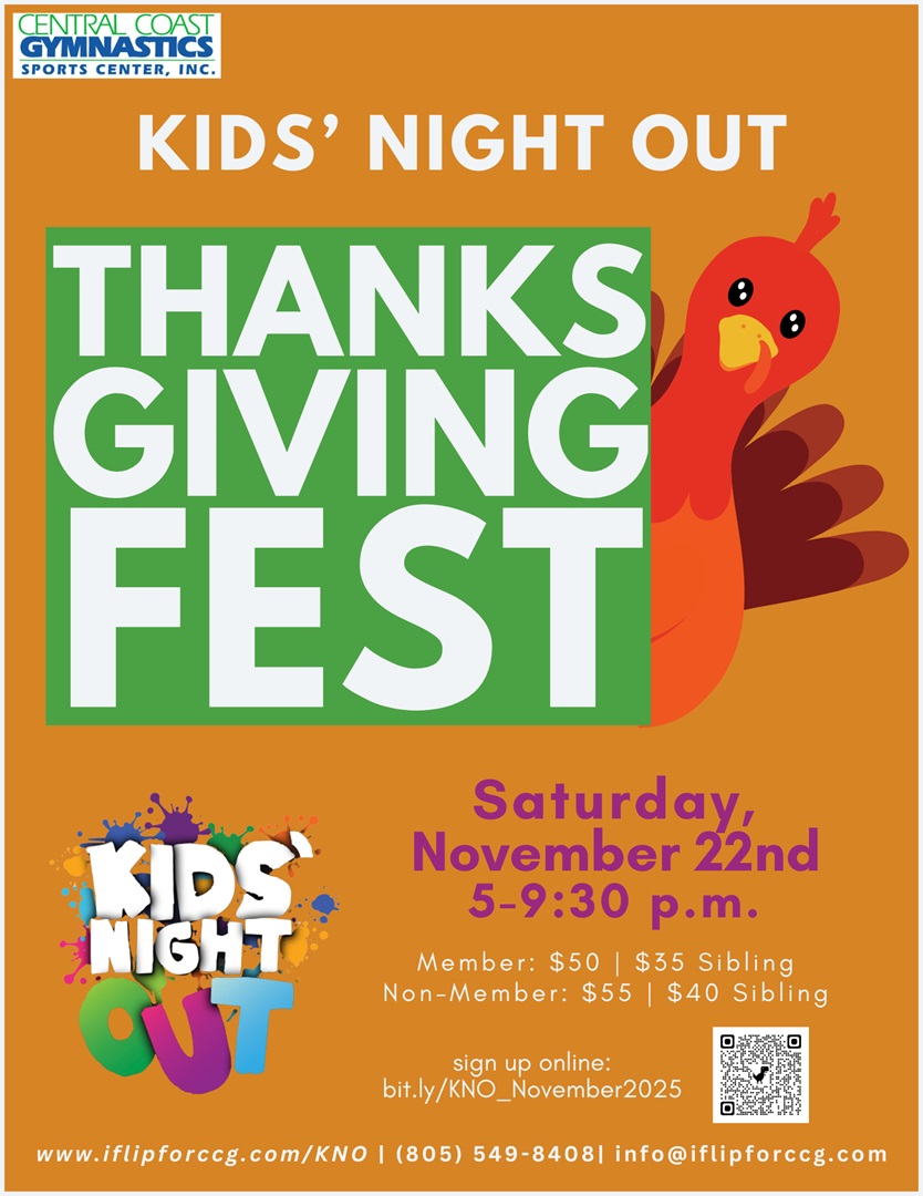 Central Coast Gymnastics is bringing back our Kid’s Night Out events! This 4.5 hour event will be held once a month and is perfect for kids ages 4-14! Everyone will enjoy fun gymnastics stations, themed activities, crafts, interactive games, pizza, snacks, and a movie!