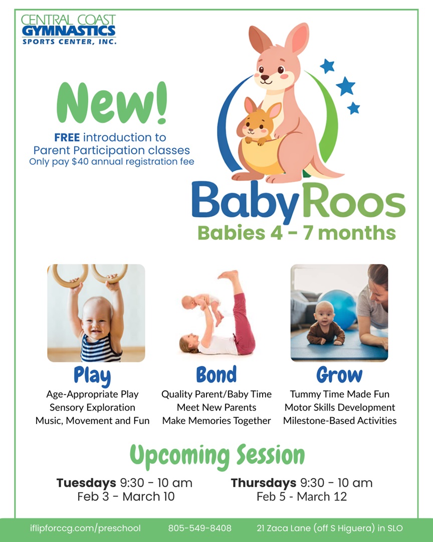 Running, jumping, hanging, balancing, tumbling and bouncing in our parent participation Roos class is a great way to focus all the energy of your little one. Each class introduces basic fundamentals of gymnastics in a fun and safe environment. Our high energy coaches use a variety of games, music and age-appropriate circuits to develop skills for listening, socializing and other fundamental development! This class will incorporate listening skills, waiting turns and sharing to prepare them for gymnastic classes on their own!