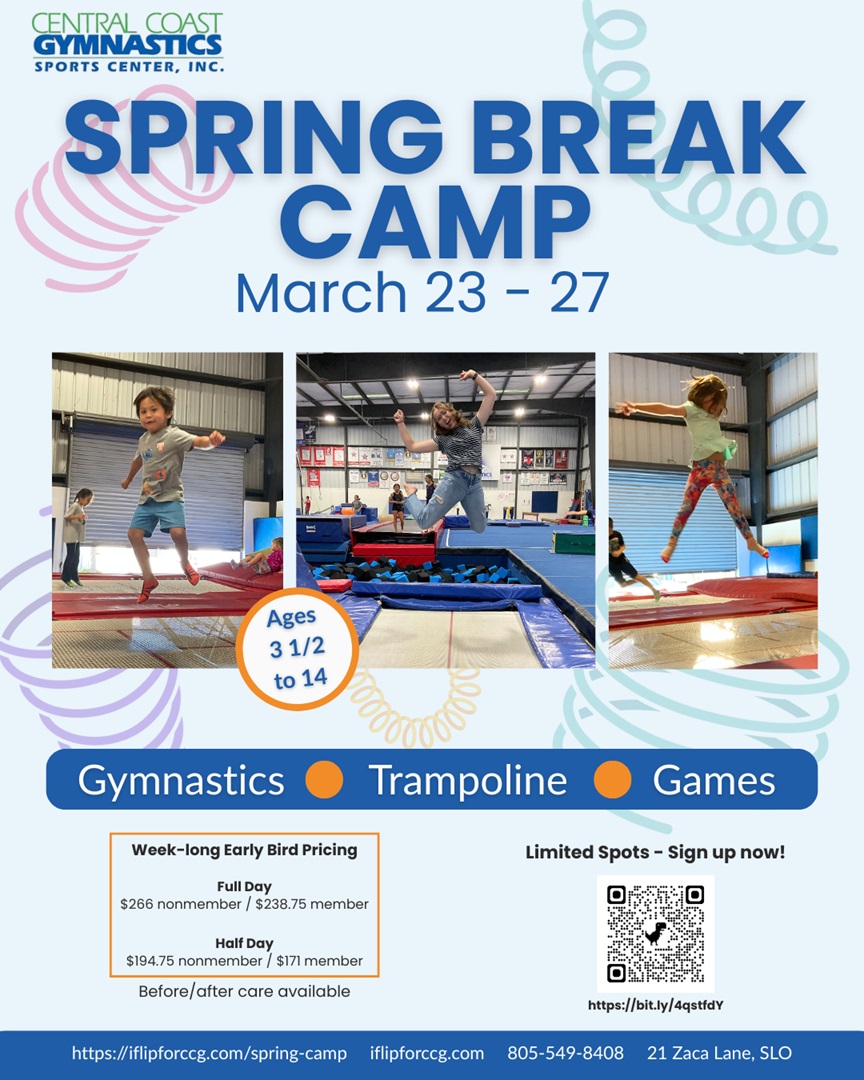 Let Central Coast Gymnastics put that SPRING in your CAMP with our upcoming SPRING Break Camp -hosted during San Luis Coastals Spring Break week.