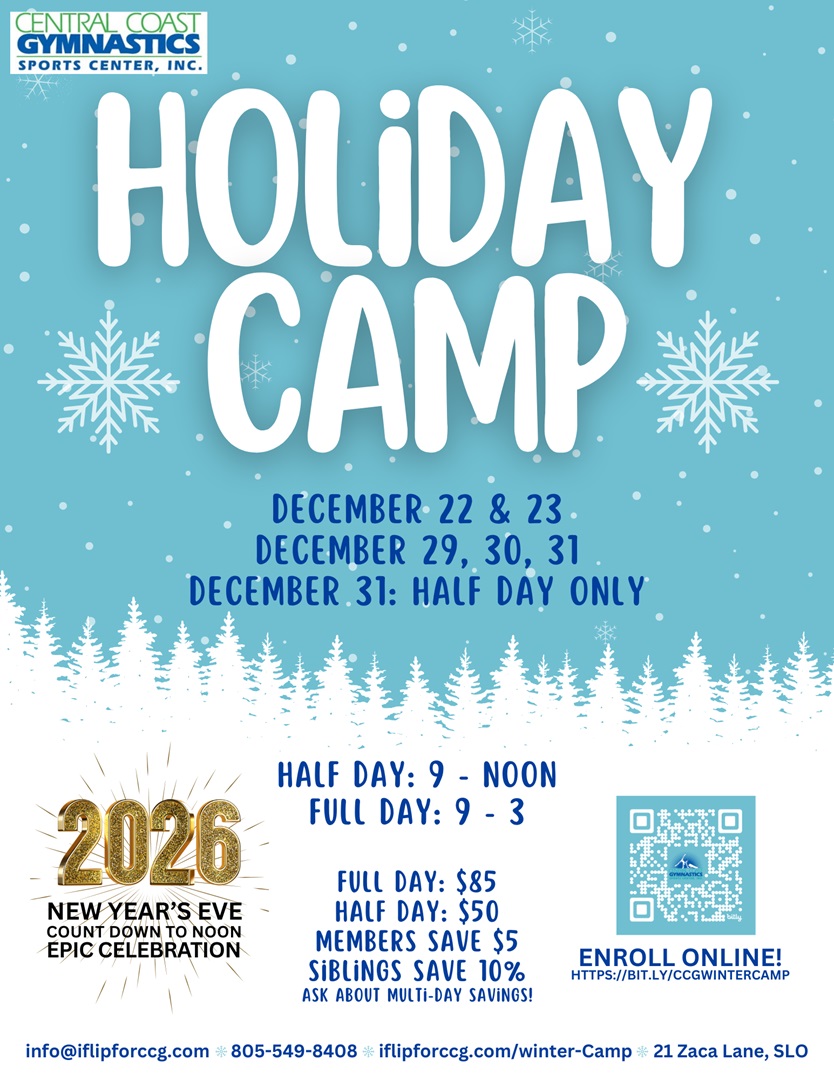 CCG’s Holiday Camp-a-Palooza is packed with action and fun throughout winter break! Join in on the festivities as our campers celebrate the holiday season and the new year. Children of all levels and abilities, ages 4-13, are welcome. Read more below about the fun activities CCG has planned! Call our office, or email our Camp Director (camp@iflipforccg.com), to register your child and be sure to get your Early-bird discount!